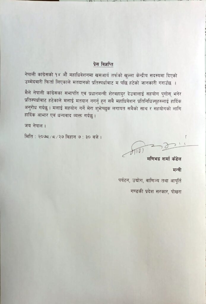 काठमाडौं । नेपाली कांग्रेसका नेता एवम् गण्डकी प्रदेश सरकारका पर्यटन, उद्योग, वाणिज्य तथा आपूर्तिमन्त्री मणिभद्र शर्मा कँडेलले कांग्रेसको केन्द्रीय सदस्य पदबाट उम्मेदवारी फिर्ता लिँदा पनि शुभेच्छुकहरूले दिएको माया र सद्भावप्रति आभार प्रकट गरेका छन् ।