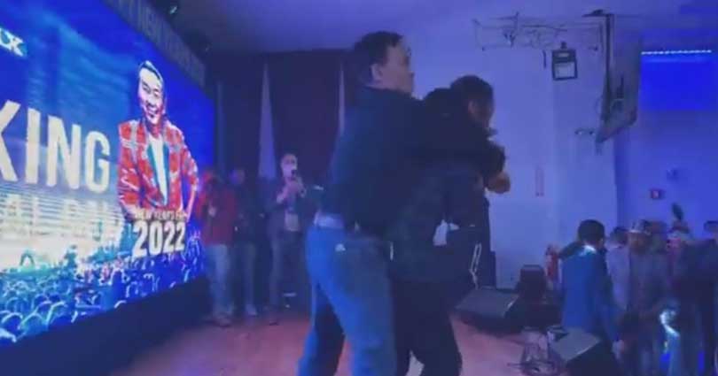 स्टेजमै चढेर एकजना दर्शकले राईले घाँटीमा दुइटा हातले छोपेर तानेर पिटेको भिडियोमा देखिएको छ । स्टेजमै चढेर गायक राईलाई कुट्ने व्यक्तिको परिचय खुलाइएको छैन ।