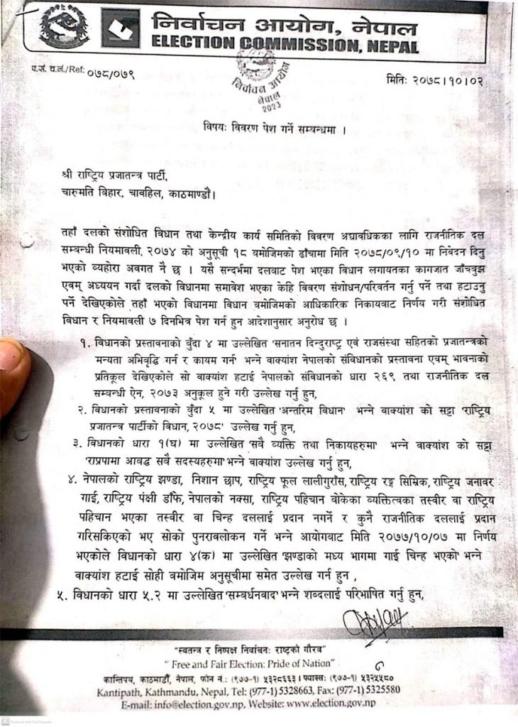 संविधानको प्रस्तावना एवम् भावना प्रतिकूल भएको भन्दै आयोगले राप्रपालाई सो कुरा हटाउन भनेको छ ।