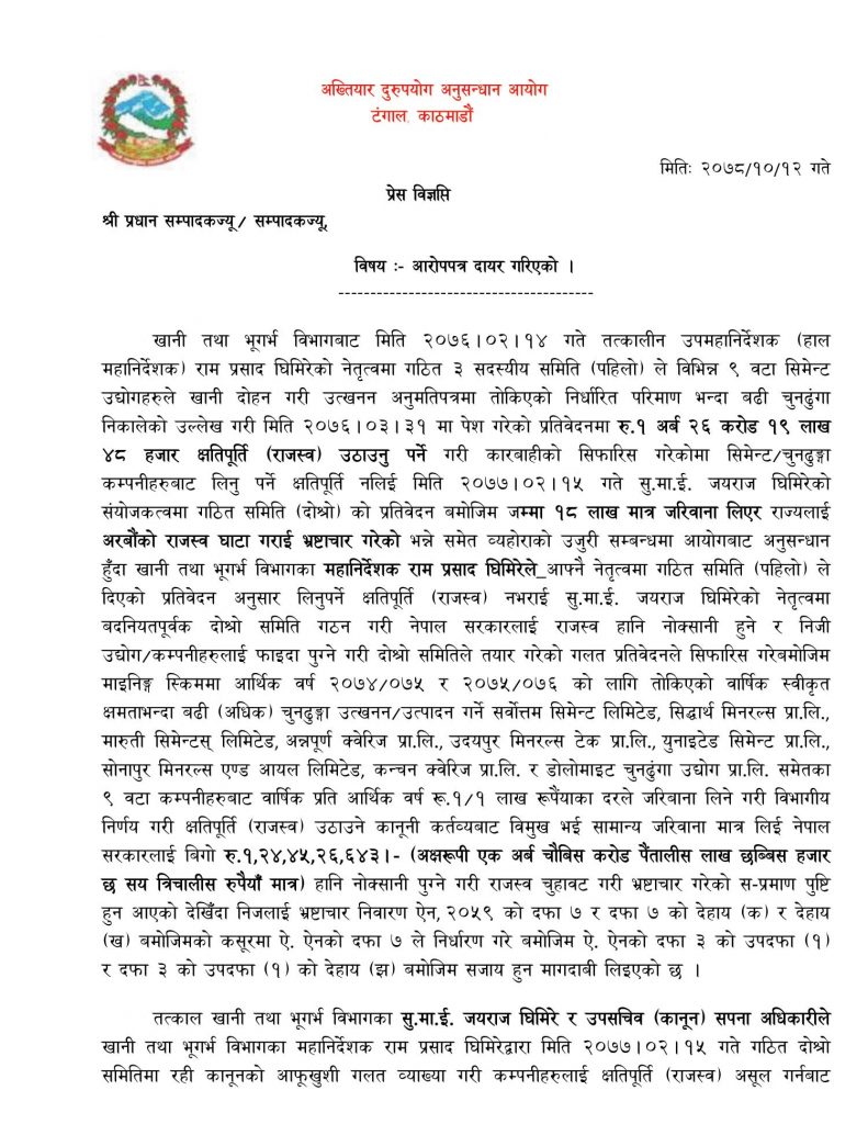 काठमाडौं । अख्तियार दुरुपयोग अनुसन्धान आयोगले खानी तथा भूगर्भ विभागका महानिर्देशक रामप्रसाद घिमिरेसहितका १८ जनाविरुद्ध १ अर्ब २४ करोडभन्दा धेरै भ्रष्टाचार गरेको अभियोगमा मुद्धा दायर गरेको छ ।