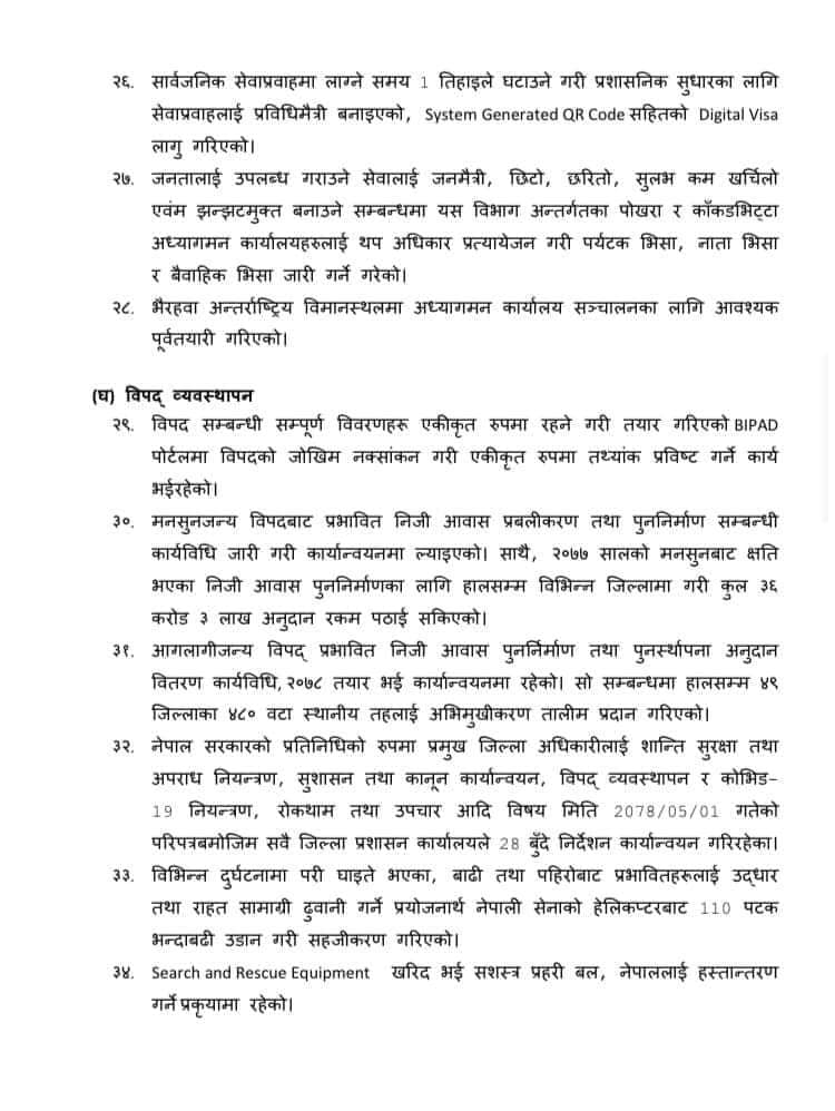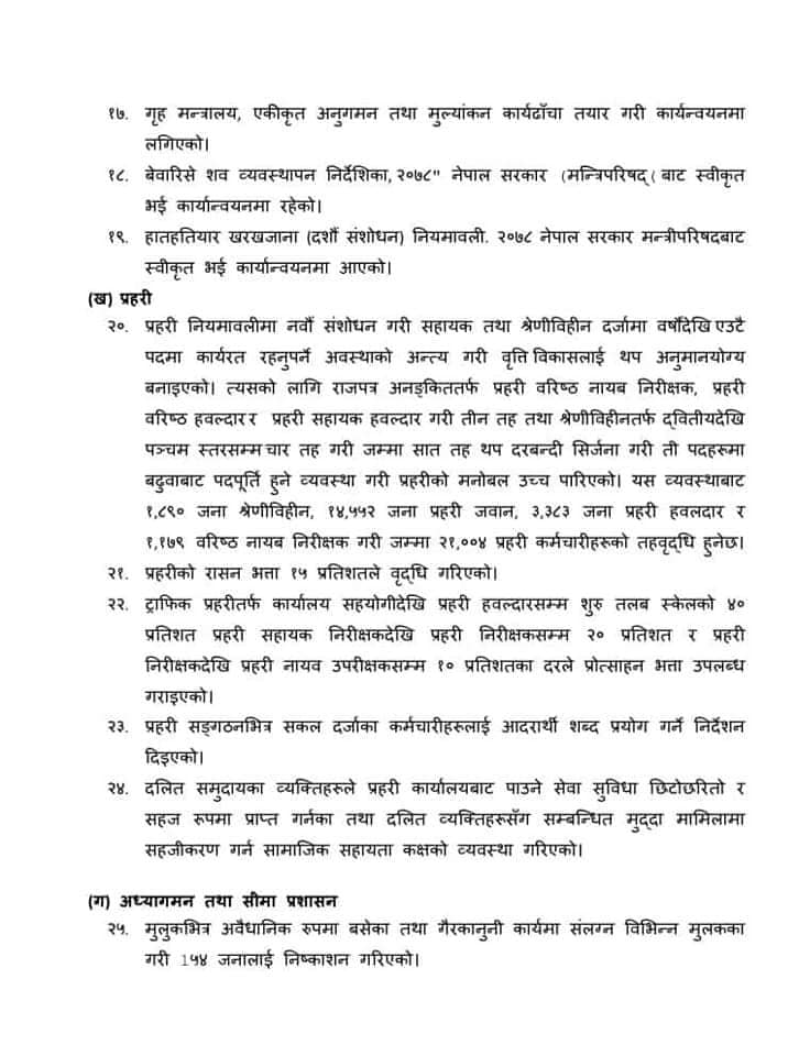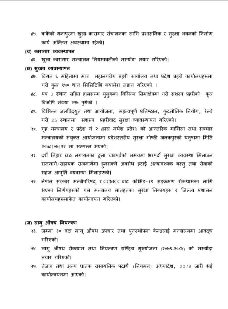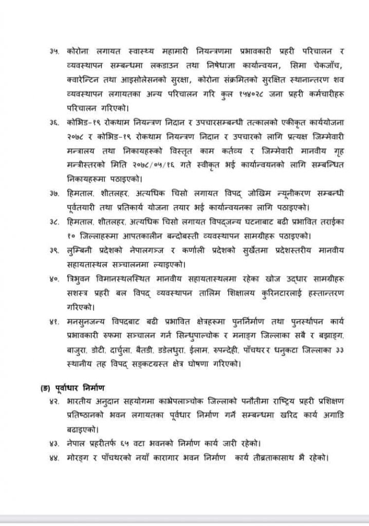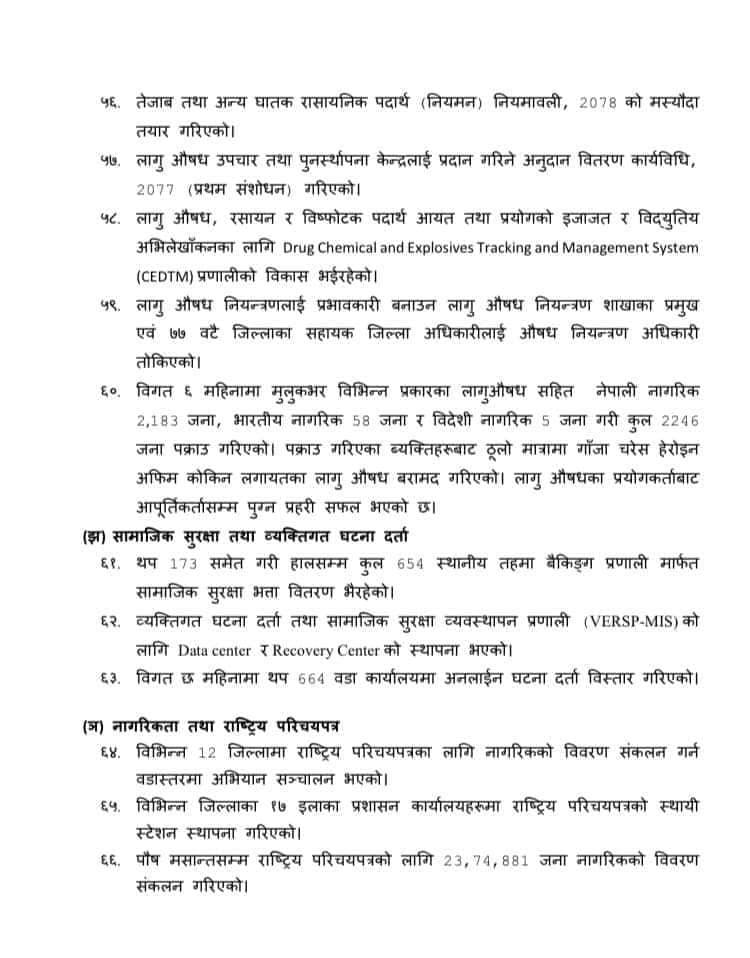 कसुरजन्य सम्पत्ति व्यवस्थापन विभागको स्थापना गरिएको, नेपाल प्रहरी र प्रदेश प्रहरी (कार्य सञ्चालन, सुपरिवेक्षण र समन्वय) (पहिलो संशोधन) अध्यादेश, २०७७ जारी, अन्तर प्रदेश प्रहरी परिचालन निर्देशिकाको मस्यौदा तयार भएको जस्ता विषय पनि गृह मन्त्रालयले ६ महिनाभित्र कार्यहरू गरेको सूचीमा उल्लेख गरेको छ ।