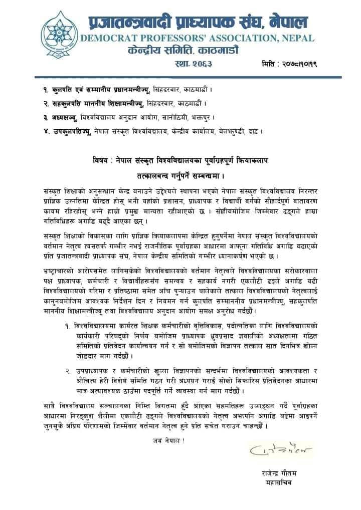 भ्रष्टाचारको आरोपसमेत लागिसकेको विश्वविद्यालयको वर्तमान नेतृत्वले विश्वविद्यालयका सरोकारवाला पक्ष प्रध्यापक, कर्मचारी र विद्यार्थीसँग समन्वय र सहकार्य नगरी एकलौटी ढंगले अगाडि बढि विश्वविद्यालयको गरिमा र प्रतिष्ठामा समेत आँच पुर्याउन थालेकोले तत्काल विश्वविद्यालयको नेतृत्वलाई कानूनबमोजिम आवश्यक निर्देशन दिन र नियमन गर्न कुलपति एवम् प्रधानमन्त्री, सह–कुलपति एवम् शिक्षा र शिक्षा अनुदान आयोग समक्ष अनुरोध गरिएको पत्रमा उल्लेख छ ।