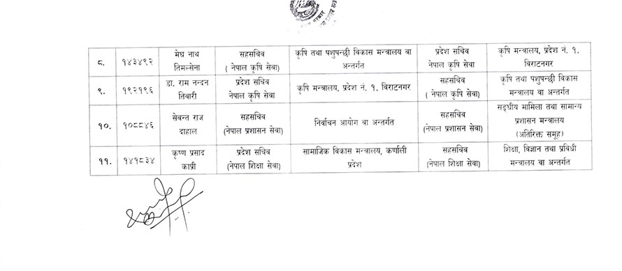 मेघनाथ तिमल्सेनाको कृषि मन्त्रालय, प्रदेश नं. १, डा.रामनन्दन तिवारीको कृषि तथा पशुपन्छी विकास मन्त्रालय, सेवन्तराज दाहालको संघीय मामिला तथा सामान्य प्रशासन मन्त्रालय र कृष्णप्रसाद काप्रीको शिक्षा, विज्ञान तथा प्रविधी मन्त्रालयमा सरुवा भएको छ ।