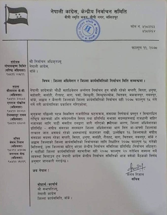 निर्वाचन समितिका सचिव केशव रिजालले निर्वाचन अधिकृतहरूलाई बुधबार परिपत्र जारी गरेर १० जिल्लाको अधिवेशन फागुन १५ को साटो फागुन २० गते अधिवेशन गर्न भनेका छन् ।