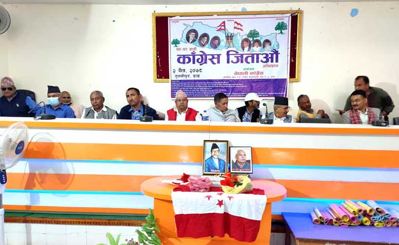 दाङ कांग्रेसको क्षेत्र नं. ३ ले बुधबार तुलसीपुरमा आयोजना गरेको ‘घर–घर जाऔं, कांग्रेसलाई जिताऔं’ अभियानअन्तर्गतको कार्यक्रमलाई सम्बोधन गरेका नेताहरूलाई कम्युनिस्टलाई हराउने मौका आएको बताएको कांग्रेसका युवा नेता वीरबहादुर खत्रीले जानकारी दिए ।