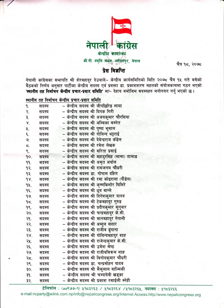 काठमाडौं । नेपाली कांग्रेसका सभापति शेरबहादुर देउवाले ६७ ‘स्थानीय तह निर्वाचन केन्द्रीय प्रचार–प्रसार समिति’ बिस्तार गरेका छन् ।
