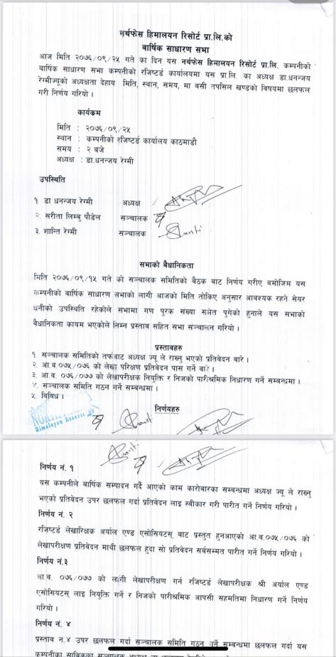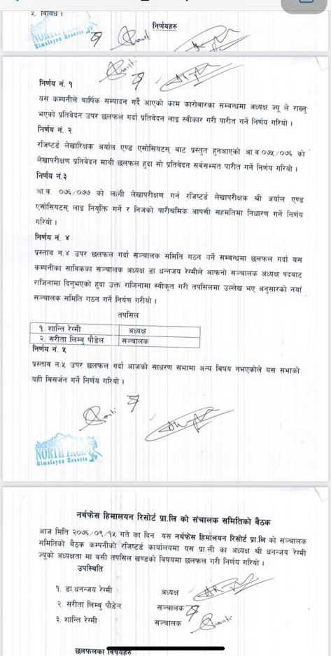 डा.रेग्मीले नर्थफेस हिमालय रिसोर्ट प्रालिबाट दिएको राजीनामा सञ्चालक समितिको बैठकले २०७६ माघ १५ गते स्वीकृत गरेको थियो । सोको अभिलेख सञ्चालक समितिले कम्पनी रजिष्टारको कार्यालयमा बुझाइसकेको छ ।