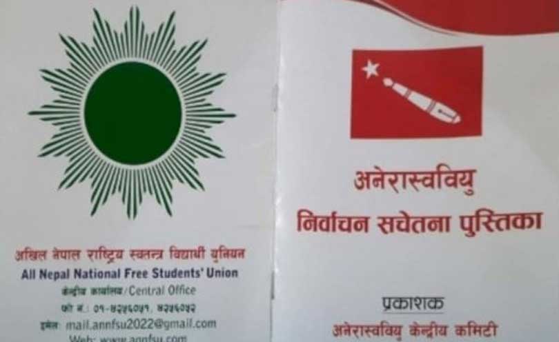 अनेरास्ववियुको केन्द्रीय कमिटी प्रकाशक रहेको ‘निर्वाचन सचेतना पुस्तक’मा एमालेको चुनाव चिन्ह ‘सूर्य’लाई हरियो रंगमा छापेर पुस्ताक बाहिर ल्याएको छ ।