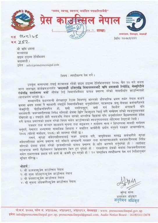 ‘पत्रकारिता क्षेत्रको मर्यादा विश्वसनीयतामा समेत नकारात्मक प्रभाव पर्ने कार्य के कसरी हुन गएको हो ? २४ घण्टाभित्र स्पष्टीकरण पेस गर्न निर्देशानुसार सूचित गरिन्छ’, पत्रमा भनिएको छ ।