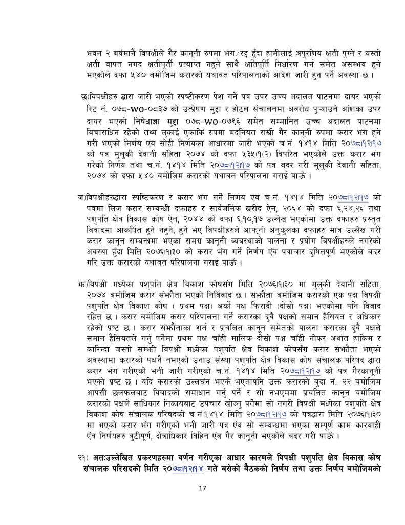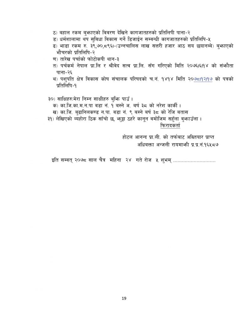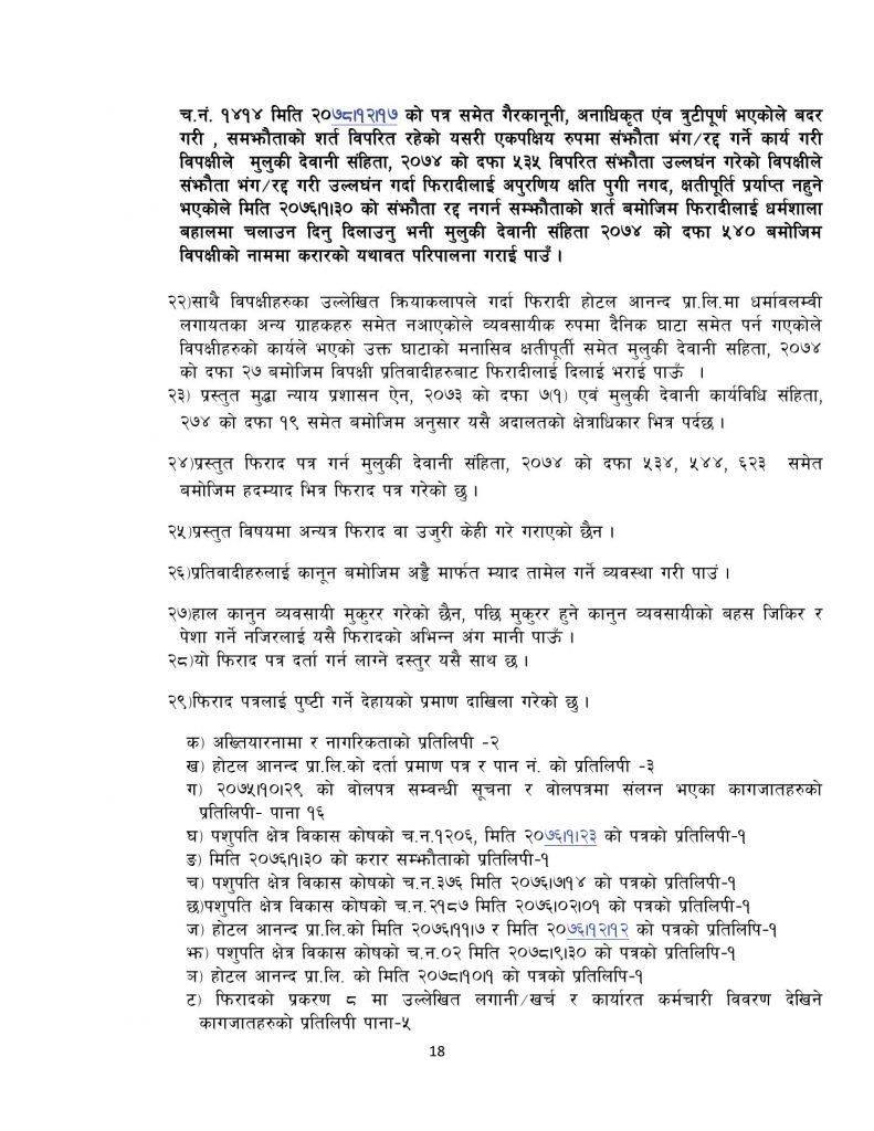 होटेल आनन्दले मुद्धामा भनेको छ, ‘ विपक्षी पशुपति क्षेत्र विकास कोष सञ्चालक परिषदको चैत १४ गते बसेको बैठकको निर्णय तथा उक्त निर्णय बमोजिमको चैत १७ गतेको पत्र समेत गैरकानूनी, अनाधिकृत एवम् त्रुटीपूर्ण भएकोले बदर गरी, सम्झौताको शर्त विपरित रहेको यसरी एकपक्षीय रुपमा सम्झौता भंग/रद्द गर्ने कार्य गरी विपक्षीले मुलुकी देवानी संहिता २०७४ को सम्झौता रद्द नगर्न सम्झौताको शर्त बमोजिम फिरादीलाई धर्मशाला बहालमा चलाउन दिनु/दिलाउनु भनी मुलुकी देवानी संहिता २०७४ को दफा ५४० बमोजिम विपक्षीको नाममा करारको यथावत परिपालन गराई पाउँ ।’