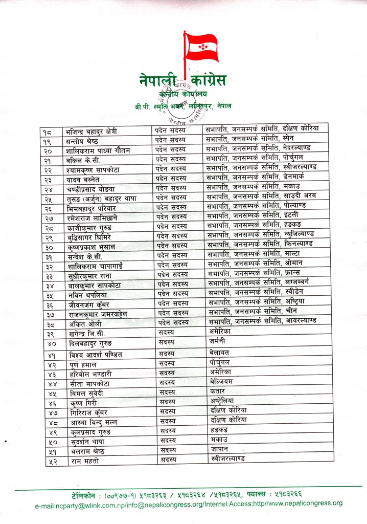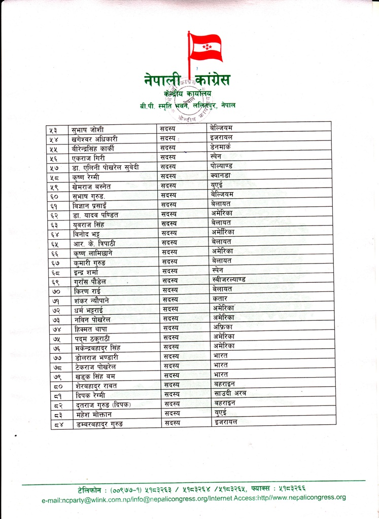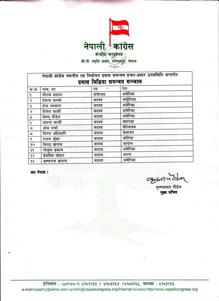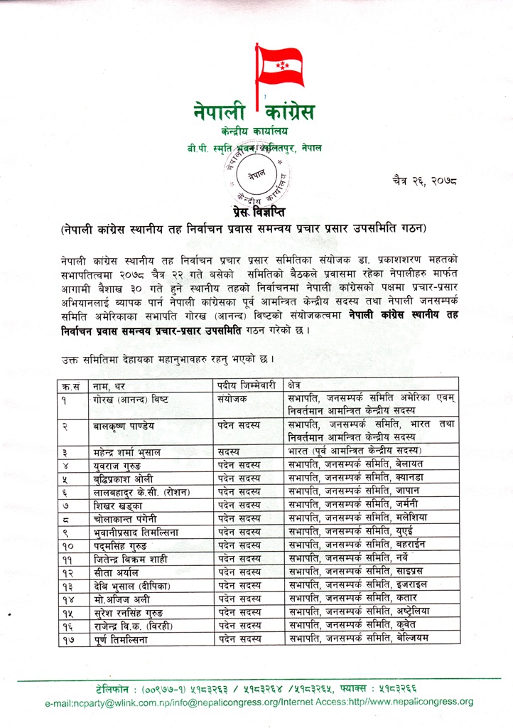 कांग्रेसका प्रवक्ता डा.प्रकाशशरण महत संयोजक रहेको समितिअन्तर्गतको उप–समितिको संयोजकको जिम्मेवारी कांग्रेसका पूर्व आमन्त्रित केन्द्रीय सदस्य तथा नेपाली जनसम्पर्क समिति अमेरिकाका सभापति गोरख विष्ट ‘आनन्द’लाई दिएको छ ।