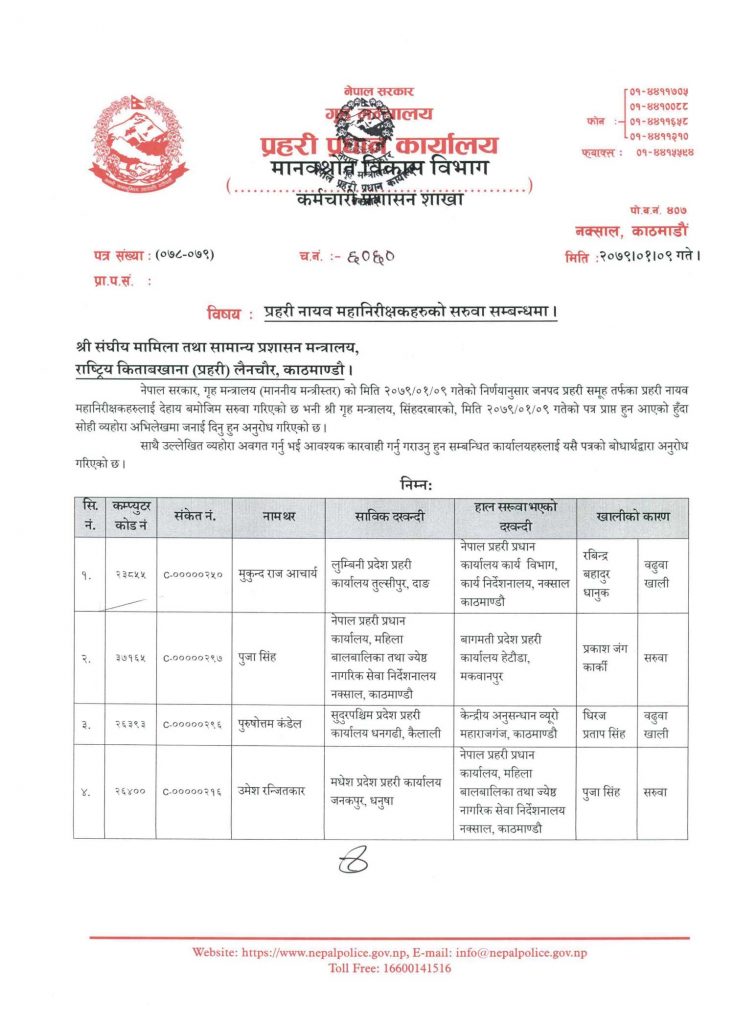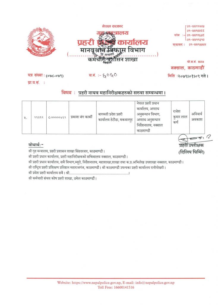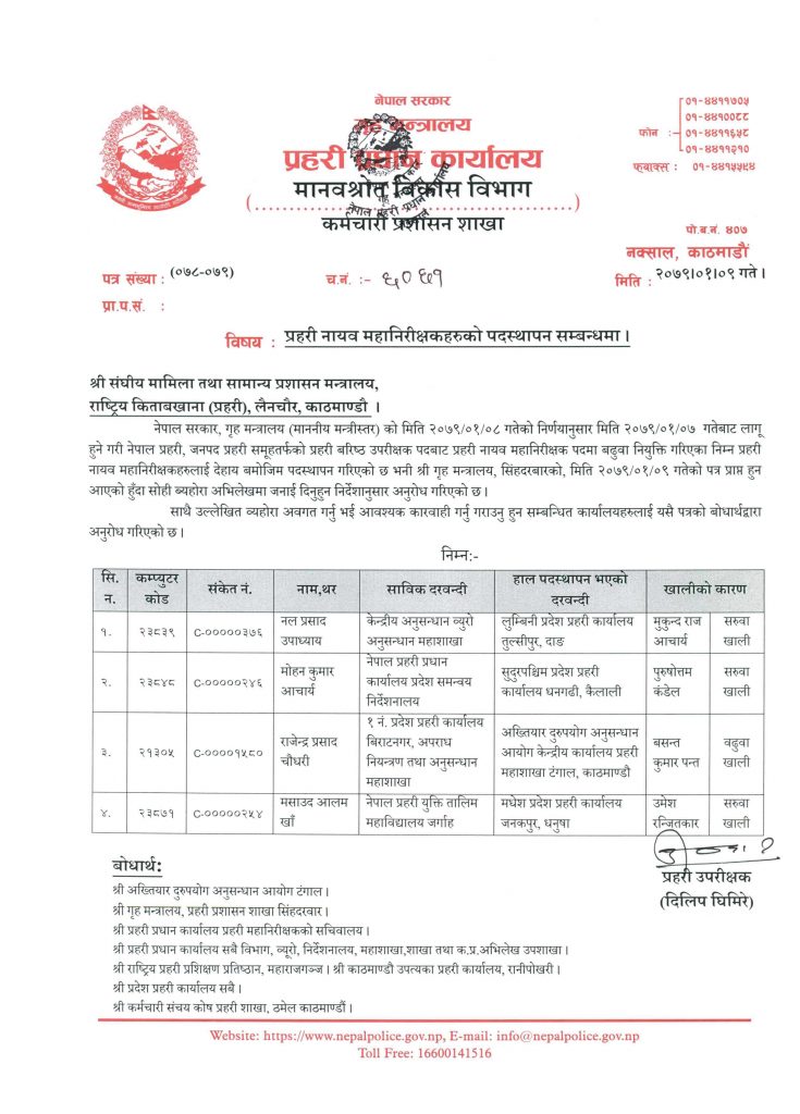 प्रदेश नं. २ का उमेश रञ्जितकार, बागमतीका प्रकाशजंग कार्की र लुम्बिनीका मुकुन्द आचार्यलाई प्रहरी प्रधान कार्यालयमा सरुवा गरिएको छ ।