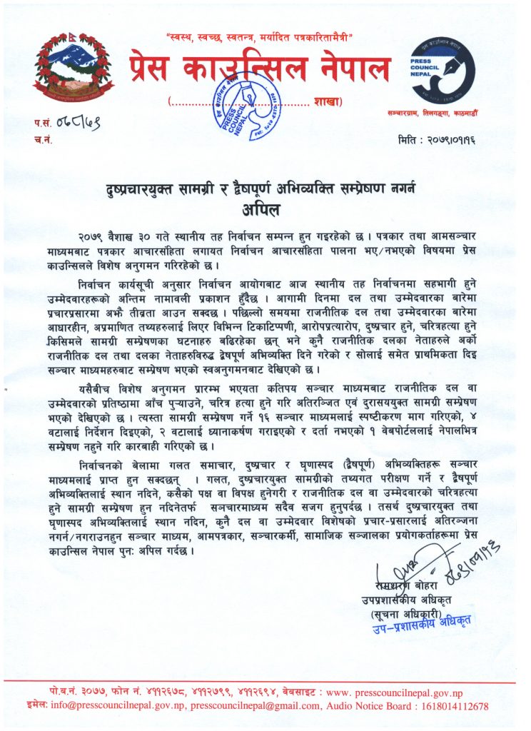 काउन्सिलका उप–प्रशासकीय अधिकृत रामशरण बोहराले शुक्रबार अपील जारी गरेर निर्वाचनको बेला गलत समाचार, दुष्प्रचार र घृणास्पद अभिव्यक्तिहरू सञ्चारमाध्यमलाई प्राप्त हुन सक्नेभन्दै सजग रहन आग्रह गरेका हुन् ।