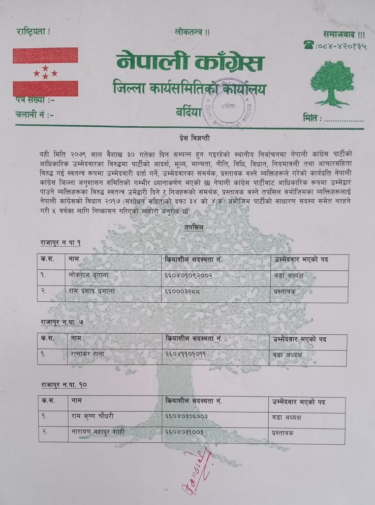 बर्दिया कांग्रेसले सोमबार विज्ञप्ति जारी गरेर बागी उम्मेदवारहरूलाई साधारण सदस्य समेत नरहने गरी ५ वर्षका लागि निष्कासन गरेको हो ।