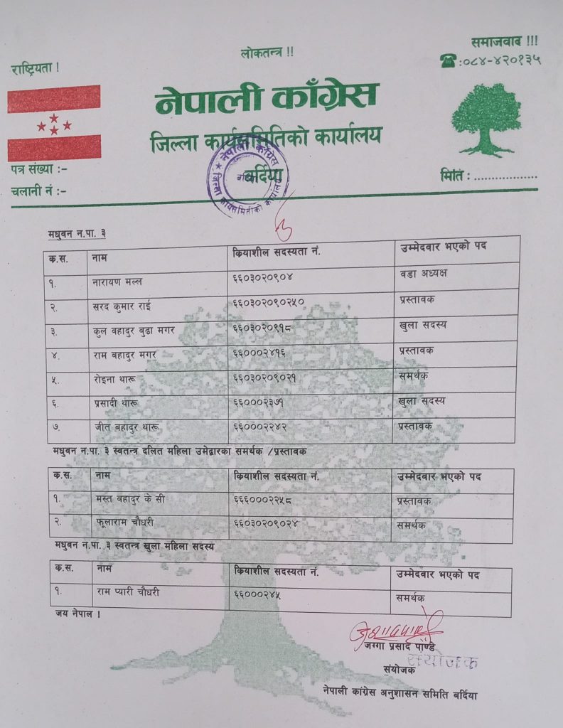 मधुवन नगरपालिका– ३ बाट नारायण मल्ल, शरदकुमार राई, कुलबहादुर बुढा मगर, रामबहादुर मगर, रोइना थारू, प्रसादी थारू र जीतबहादुर थारूलाई पनि बर्दिया कांग्रेसले साधारण सदस्य समेत नरहने गरेर निष्कासन गरेको छ ।