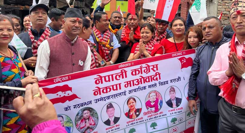 भक्तपुरको मध्यपुर थिमि नगरपालिकामा गठबन्धनका उम्मेदवारहरूको पक्षमा मत माग्न शुक्रबार आयोजित घरदैलो र र्‍याली कार्यक्रमलाई सम्बोधन गर्दै सभापति थापाले ओलीको अधिनायकवाद परास्त गर्न गठबन्धनका उम्मेदवारहरूले जित्नुपर्ने बताए । उनले गठबन्धनले नै अहँकारपूर्ण एमालेका नेताहरूलाई सबक सिकाउने बताएका छन् ।