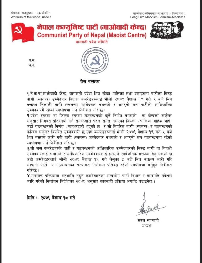 माओवादी केन्द्र बागमती प्रदेशले एमाले सग गठबन्धन गर्न नहुनेभन्दै आए पीन नेता सापकोटाले भने पैसा लिएर माओवादीको भोट बेचेको आरोप छ । सापकोता सभामुख अग्निप्रसाद सापकोटाका भतिजा हुन् ।