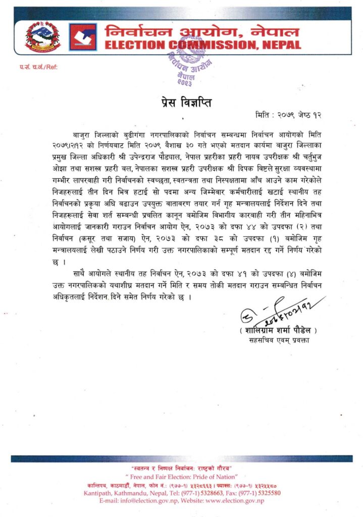 आयोगले बाजुराका मतदान अधिकृतलाई मतदानको मिति घोषणा गरेर पुन मतदान गर्न निर्देशन दिएको छ ।