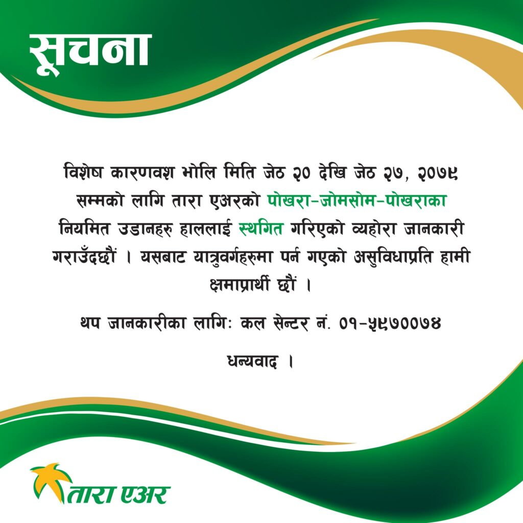 काठमाडौं । तारा एअरले पोखरा–जोमसोम–पोखराको उडान एक हप्ताका लागि स्थगित गरेको छ ।
