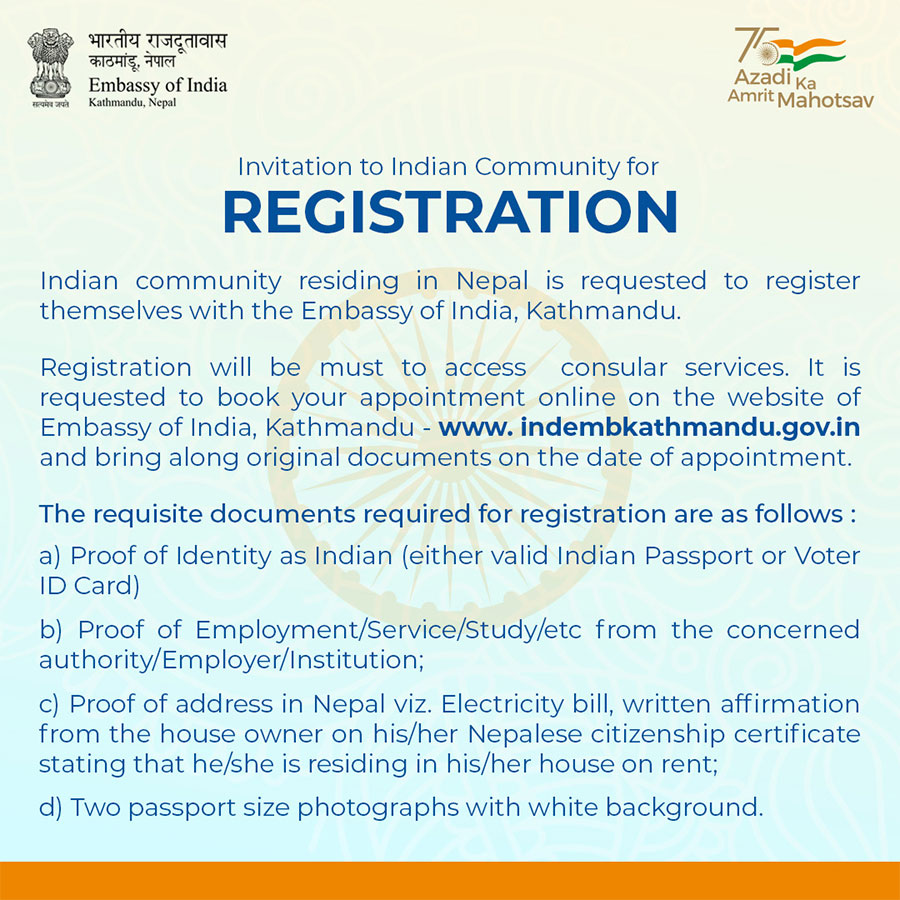 भारतीय दूतावासले सूचना जारी गरेर नेपालमा रहेका भारतीय नागरिकहरूलाई दर्ता हुन आग्रह गरेको हो । दर्ता भएका भारतीय नागरिकले मात्रै कूटनीतिक सुविधा पाउनेछन् ।