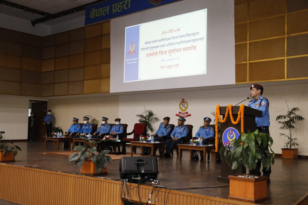 काठमाडौं । नेपाल प्रहरीका प्रहरी महानिरीक्षक (आईजीपी) धिरजप्रताप सिंहले ५ जना अतिरिक्त प्रहरी महानिरीक्षक (एआईजी)लाई दर्ज्यानी चिन्ह प्रदान गरेका छन् ।