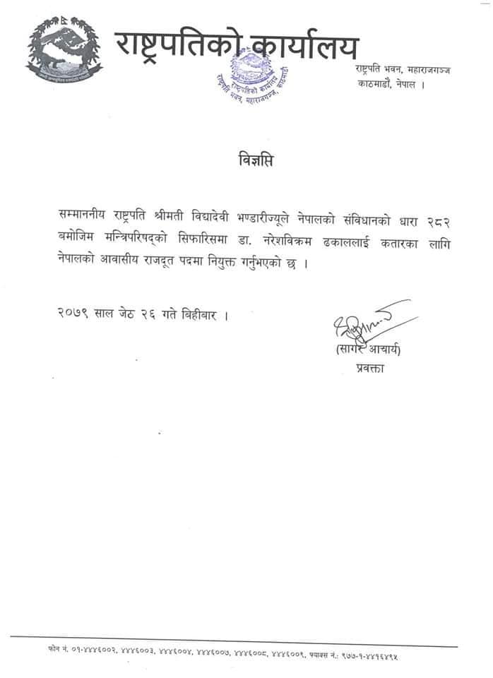 डा.नरेशविक्रम ढकाललाई कतारका लागि नेपालको आवासीय राजदूत पदमा बिहीबार नियुक्त गरेसँगै कर्णालीले राजदूत पद पाएको हो ।