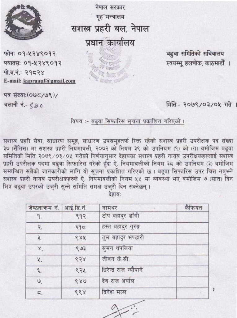 डीएसपीबाट एसपीमा बढुवाको पहिलो नम्बरमा टोपबहादुर डाँगीको नाम सिफारिस भएको छ । दोस्रो नम्बरमा हस्तबहादुर गुरुङ र तेस्रो नम्बरमा तुलबहादुर भण्डारीको नाम रहेको छ ।