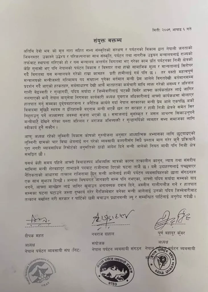 ‘यसै उदाहरणलाई पच्छ्याएर नैतिकताको आधारमा तत्काल राजीनामा दिन मन्त्री आलेलाई हामी पर्यटन व्यवसायीहरूको छाता संगठनहरू एक साथ सुझाव दिन्छौँ’, विज्ञप्तिमा उल्लेख छ ।