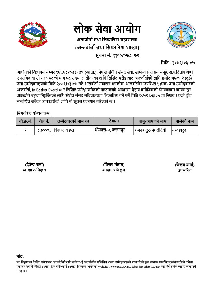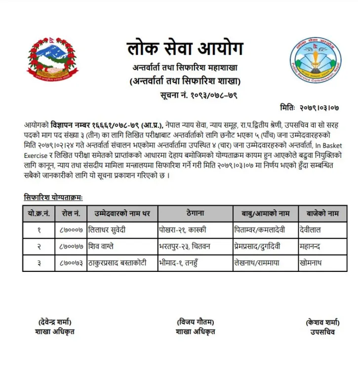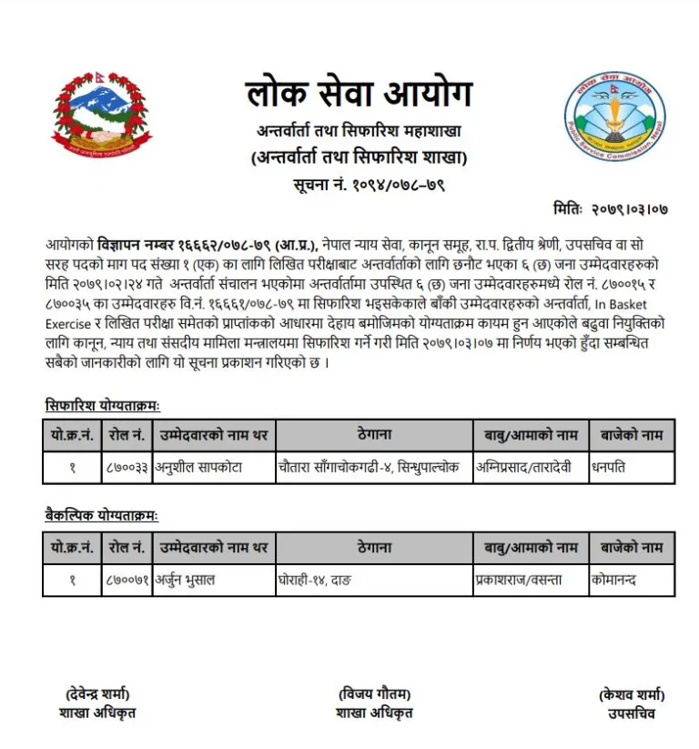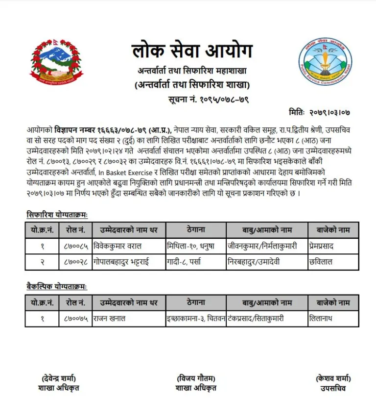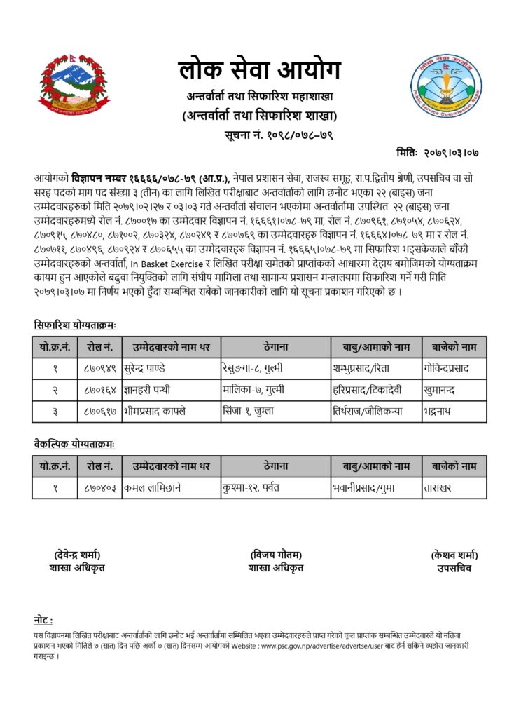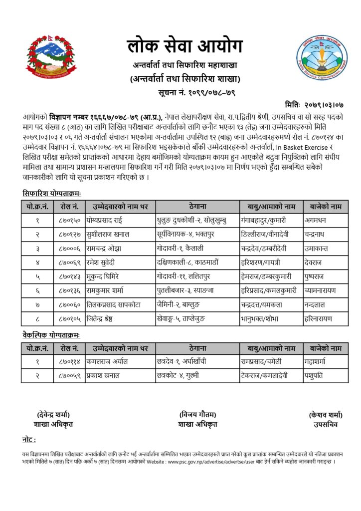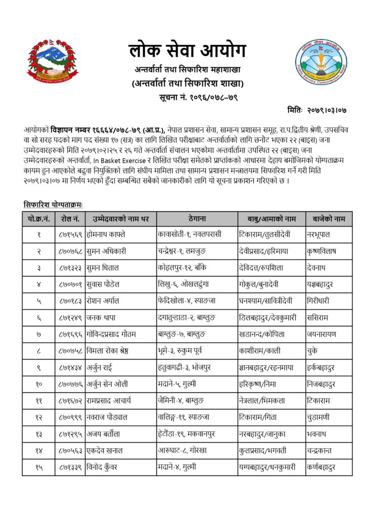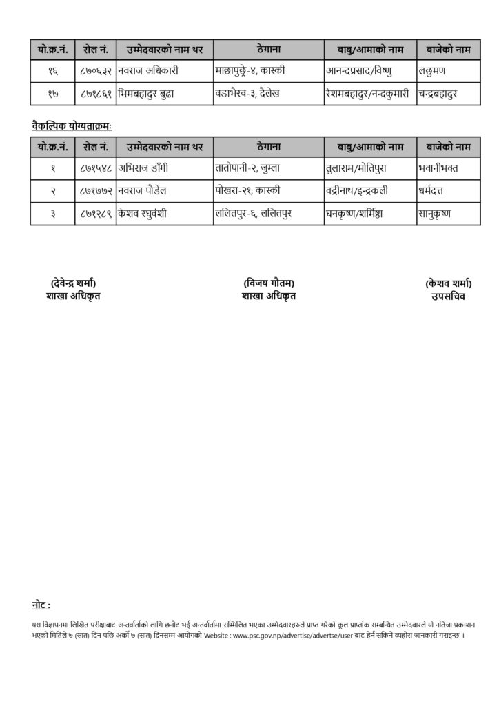 लिएको लिखित परीक्षा आएको नतीजाको प्राप्ताङ्कको आधारमा अन्तर्वार्तामा छनौट भएको आयोगले जनाएको छ ।