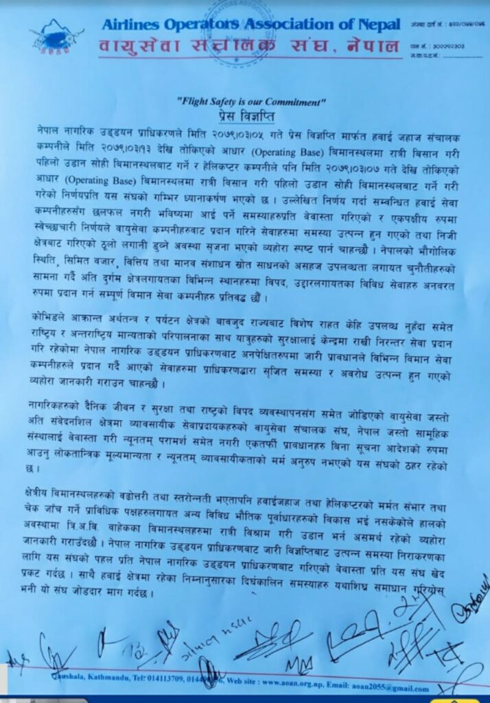 प्राधिकरणले दुई दिनको समय दिएर धेरै वायुयानलाई उपत्यका बाहिर रात्रिकालीन पार्किङमा जानुपर्ने व्यवस्था गरेपछि संघ आन्दोलित भएका छ ।