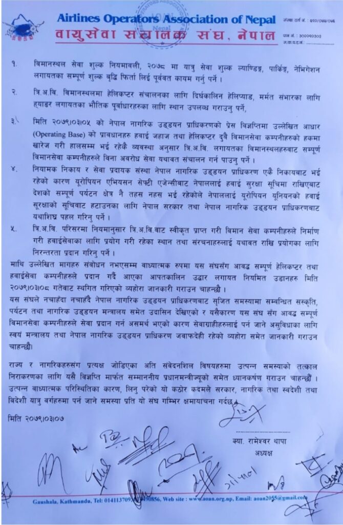 वायुयान सञ्चालकहरूलाई प्राधिकरणले दमनकारी नीति ल्याएर ट्रक व्यवसायीलाई जस्तै व्यवहार गरेको अध्यक्ष थापाले बताएका छन् ।