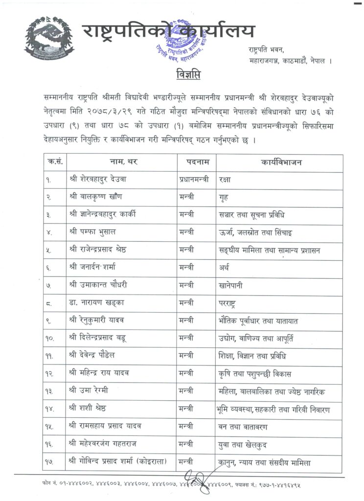 काठमाडौं । प्रधानमन्त्री शेरबहादुर देउवाले मन्त्रिपरिषद् पुनर्गठन गरेका छन् ।