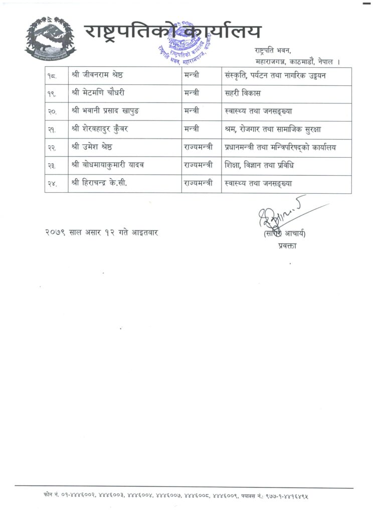 संस्कृति, पर्यटन तथा नागरिक उड्डयन मन्त्रीमा जीवनराम श्रेष्ठ, सहरी विकास मन्त्रीमा मेटमणि चौधरी, स्वास्थ्य तथा जनसंख्या मन्त्रीमा भवानीप्रसाद खापुङ, श्रम रोजगार तथा सामाजिक सुरक्षा मन्त्रीमा शेरबहादुर कुँवर र स्वास्थ्य तथा जनसंख्या राज्य मन्त्रीमा हीराचन्द्र केसी नियुक्त भएका छन् ।