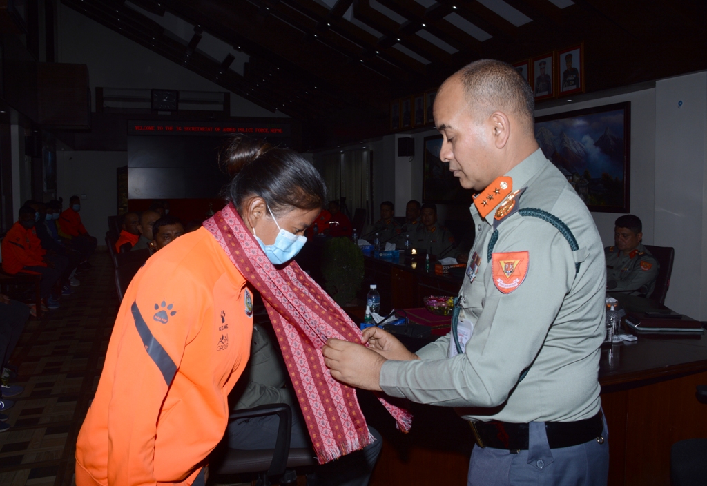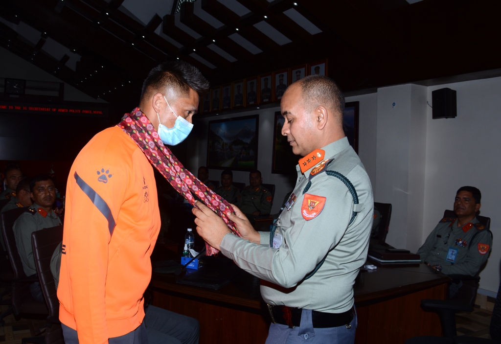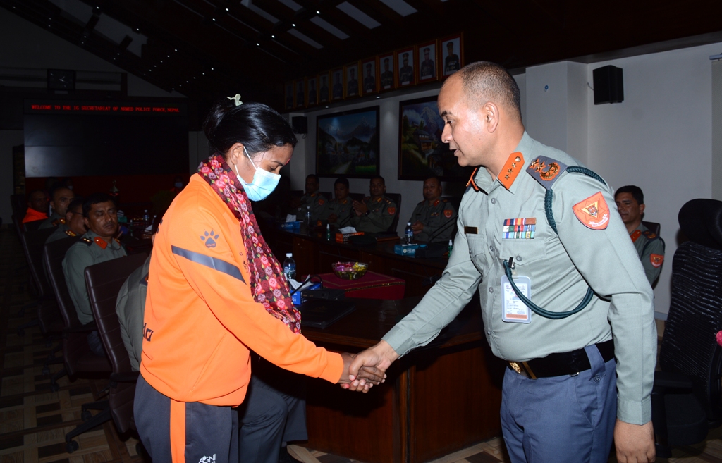 काठमाडौं । सशस्त्र प्रहरी बल नेपालका सशस्त्र प्रहरी महानिरीक्षक (आईजीपी) राजु अर्यालले ‘४४औं राष्ट्रिय एथलेटिक्स प्रतियोगिता’मा नेपाल एपीएफ क्लवका पदक विजेता खेलाडीहरूलाई सम्मान गरेका छन् ।