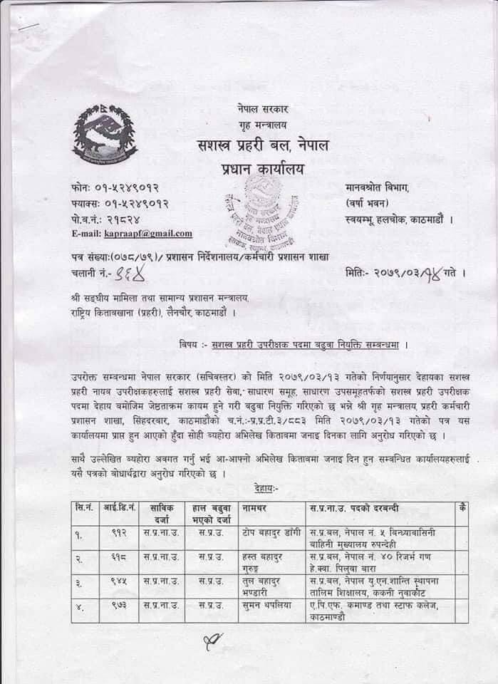 सशस्त्र प्रहरी नायब उपरीक्षकलाई सेवा, साधारण समूह, साधारण उपसमूहतर्फको पदमा जेष्ठताक्रम कायम हुने गरी बढुवा नियुक्ति गरिएको जनाइएको छ ।