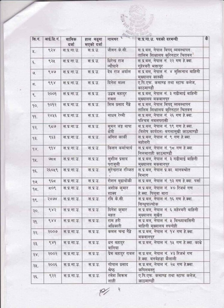 सुमनजंग थापा क्षेत्री, अनिल कार्की, किसन कर्माचार्य, किसन कर्माचार्य, सुशीलप्रसाद पराजुली, सुरेन्द्रराज रञ्जित, रोशन बुढाथोकी, अशोककुमार शाक्य, रवि केसी, दिनेशकुमार महत, रामहरि अधिकारी, कमलचन्द्र गैह्रे, धनबहादुर बानियाँ, प्रेमबहादुर रावल, गोपालप्रसाद श्रेष्ठ, रमेशविक्रम शाहीको बढुवा भएको छ ।