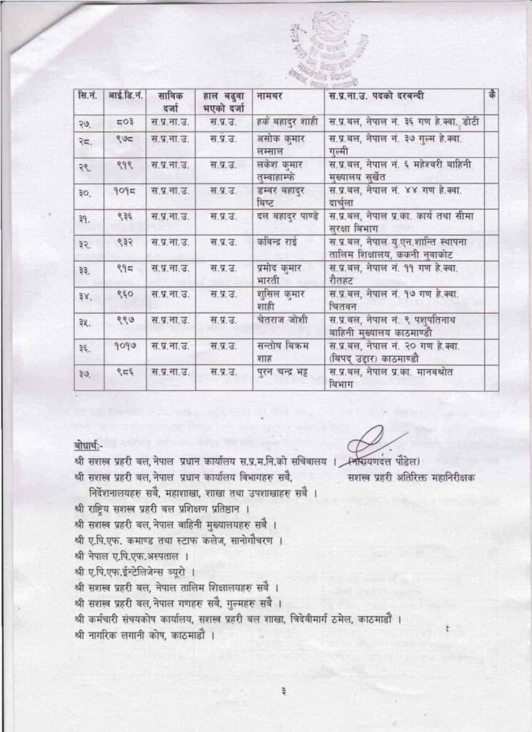 हर्कबहादुर शाही, अशोककुमार लम्साल, लकेशकुमार तुम्बाहाम्फे, डम्बरबहादुर विष्ट, दलबहादुर पाण्डे, कविन्द्र राई, प्रमोदकुमार भारती, सुशीलकुमार शाही, चेतराज जोशी, सन्तोषविक्रम शाह र पुरनचन्द्र भट्टको बढुवा र दरबन्द कायम भएको छ ।