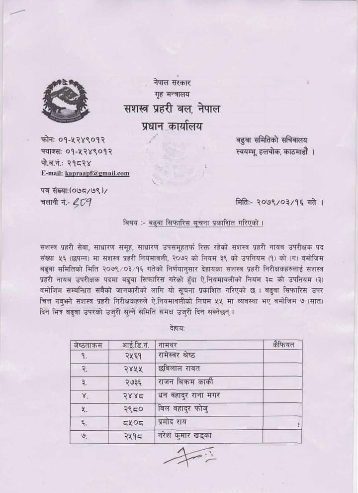 बढुवा सिफारिसमाथि चित्त नबुझे ७ दिनभित्र उजुरी दिन सशस्त्र प्रहरी बलको प्रधान कार्यालयले भनेको छ ।