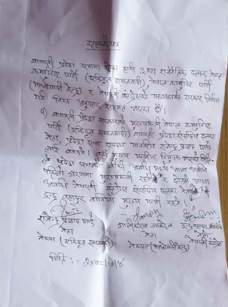 सहमति पत्रमा भनिएको छ, ‘बागमती प्रदेश सरकारको मुख्यमन्त्री नेपाल कम्युनिस्ट पार्टी (एकीकृत समाजवादी) बागमती प्रदेश संसदीय दलका नेता, प्रदेश सभा सदस्य माननीय राजेन्द्रप्रसाद पाण्डलाई बनाउने निर्णय ।’