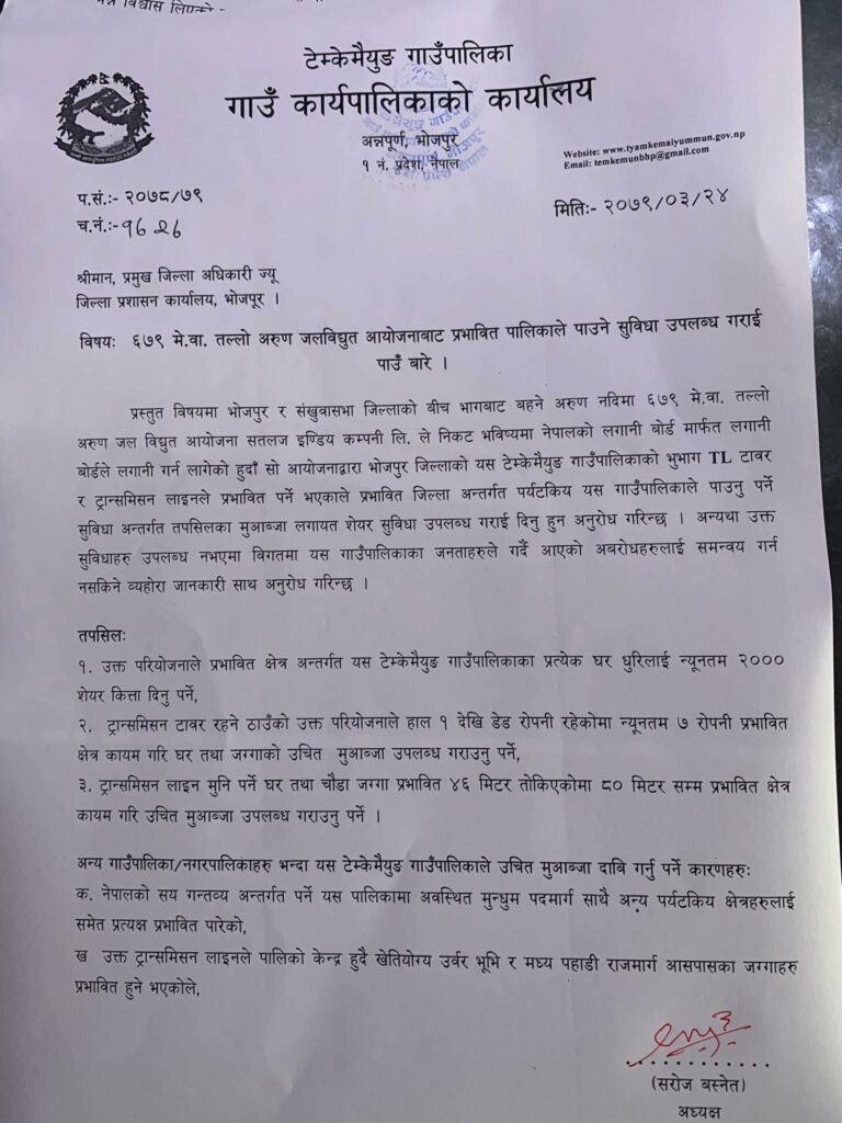 अध्यक्ष बस्नेतद्वारा टेम्केमैयुङका जनतालाई तल्लो अरुण आयोजनासँग क्षतिपूर्ति माग, पठाए पत्र