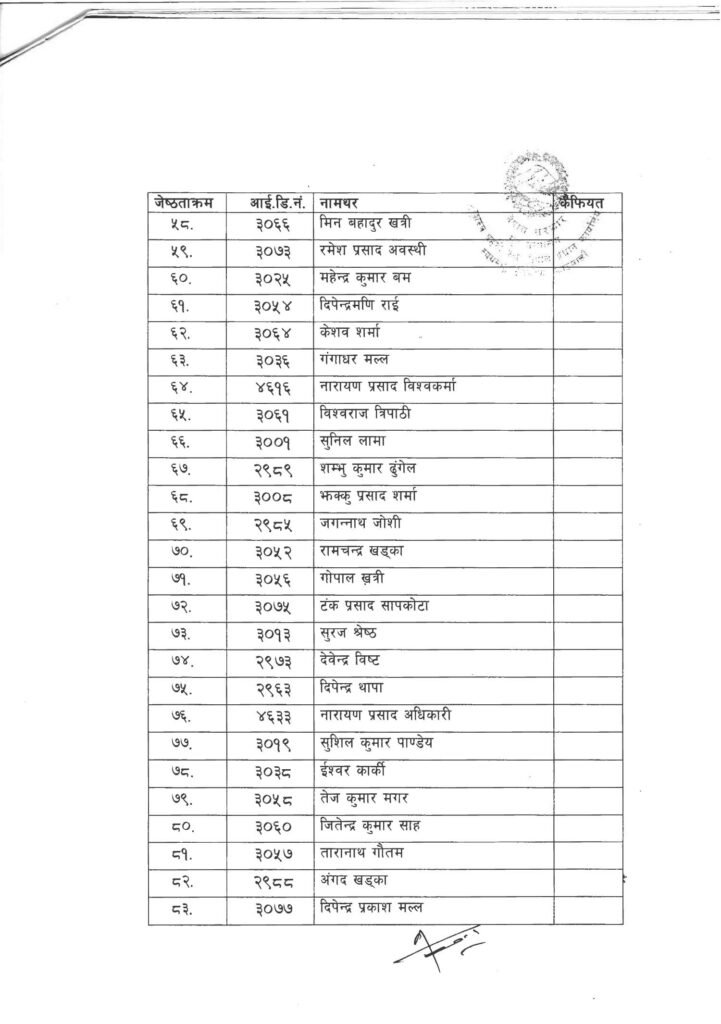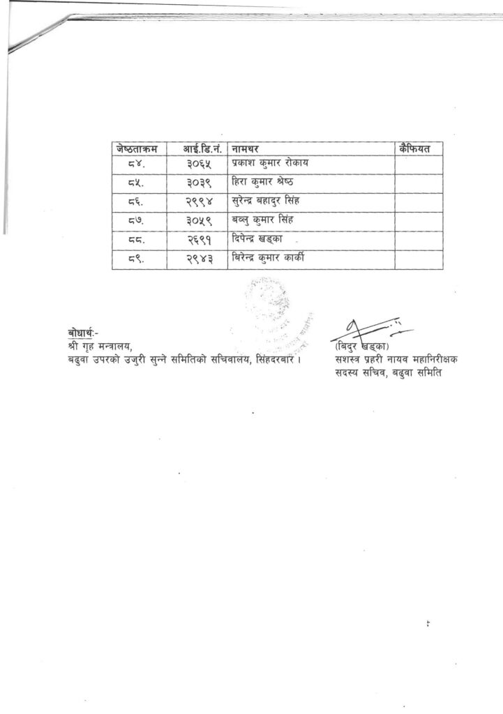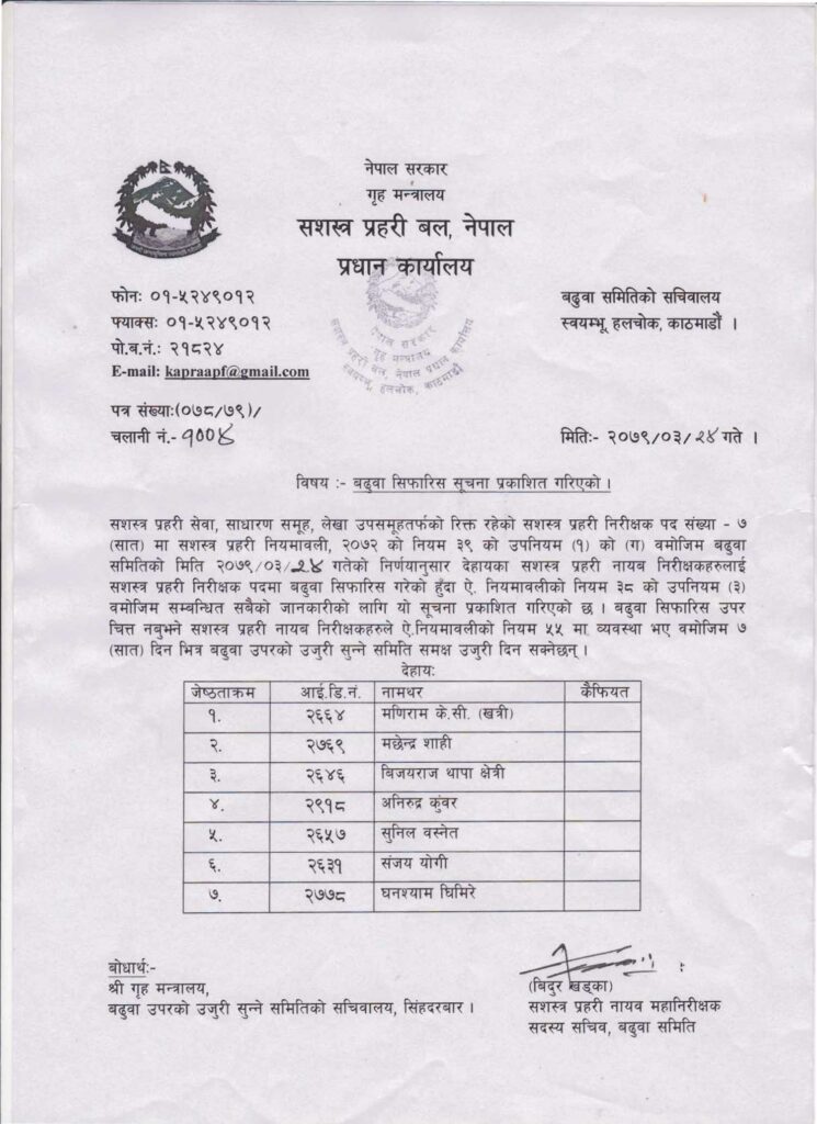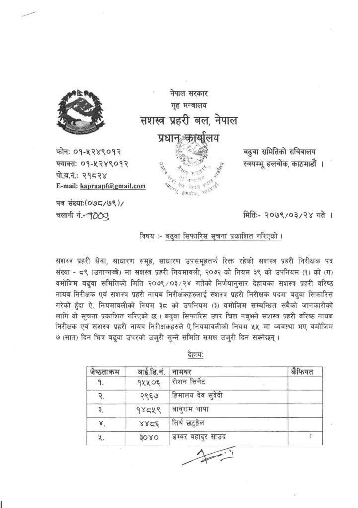 सशस्त्र प्रहरी सेवा, साधारण समूह, साधारण उप–समूहतर्फ रिक्त रहेका निरीक्षक पदमा बढुवा सिफारिस गरिएको हो ।