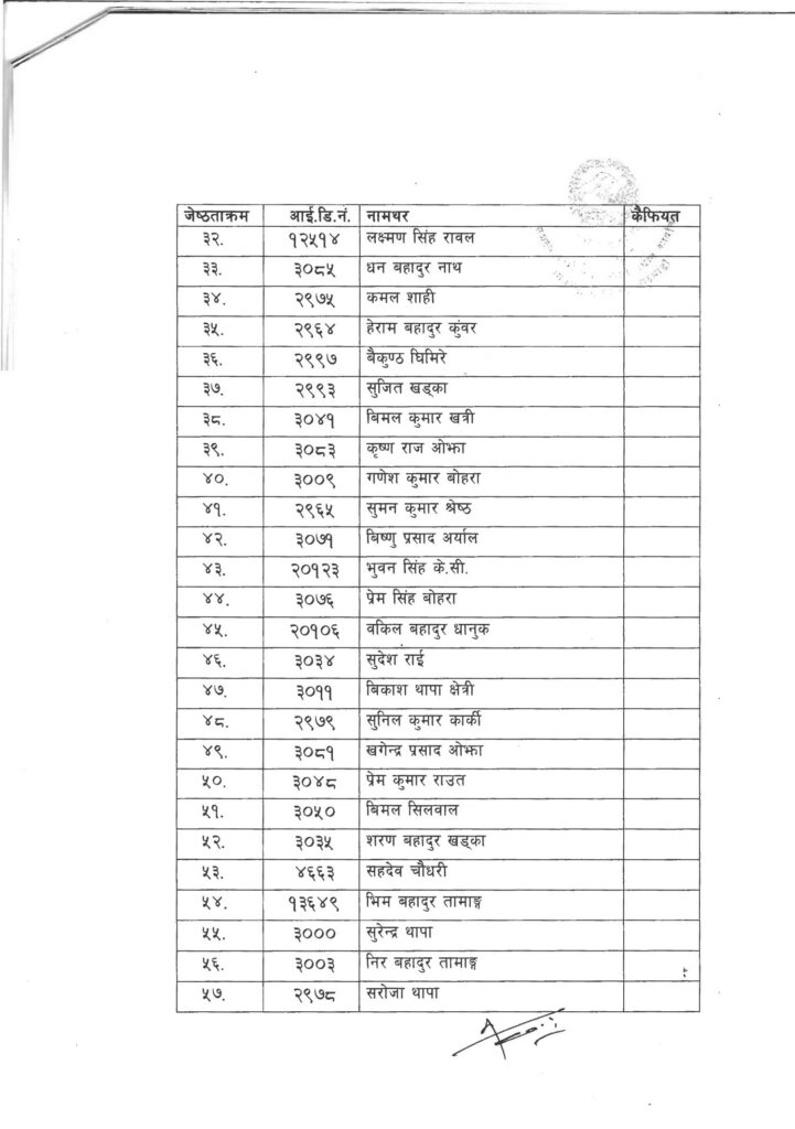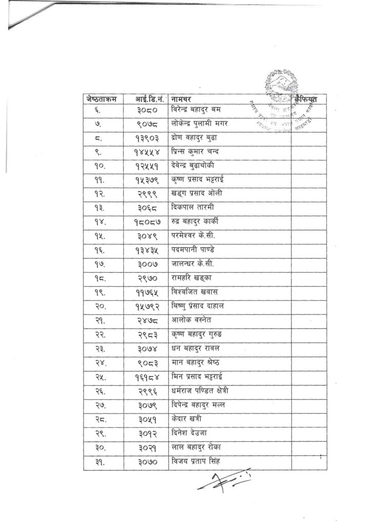 बढुवाको सिफारिसमा पहिलो नम्बरमा रोशन सिर्नेट परेका छन् । दोस्रो नम्बरमा हिमालयदेव सुवेदी र तेस्रो नम्बरमा बाबुराम थापा परेका छन् । सबैभन्दा पुछार ८९औं नम्बरमा वीरेन्द्रकुमार कार्की परेका छन् ।