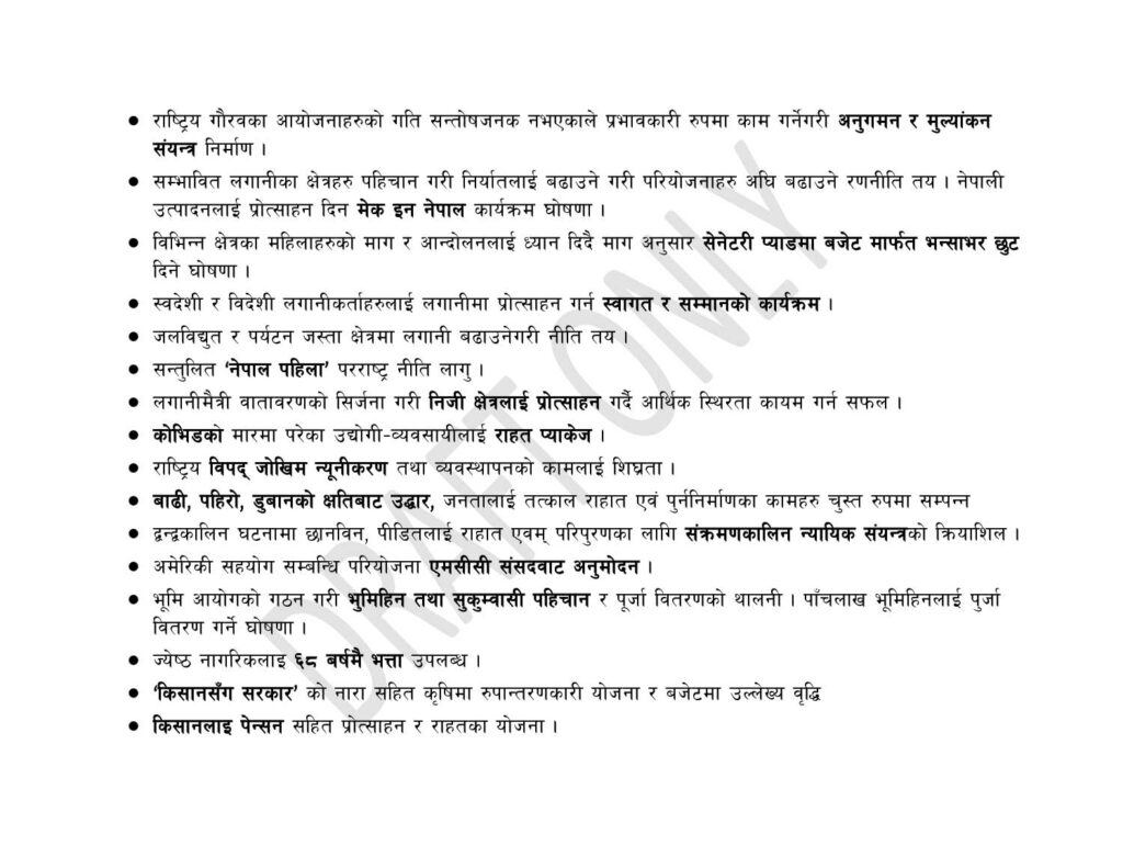 जटिल प्रकारका रोग लागेका नागरिकलाई मासिक पाँच हजार रुपियाँ राहत भत्ता, गरिवीका रेखामुनि रहेका बिरामीका लागि ९८ प्रकारका औषधि निःशुल्क, वैदेशिक रोजगारीबाट फर्केका युवालाई सहुलियतपूर्ण कर्जा, प्रधानमन्त्री रोजगार कार्यक्रममार्फत दुई लाखलाई रोजगारीको सुनिश्चितता गरेको सरकारले महत्वपूर्ण काममा राखेको छ ।