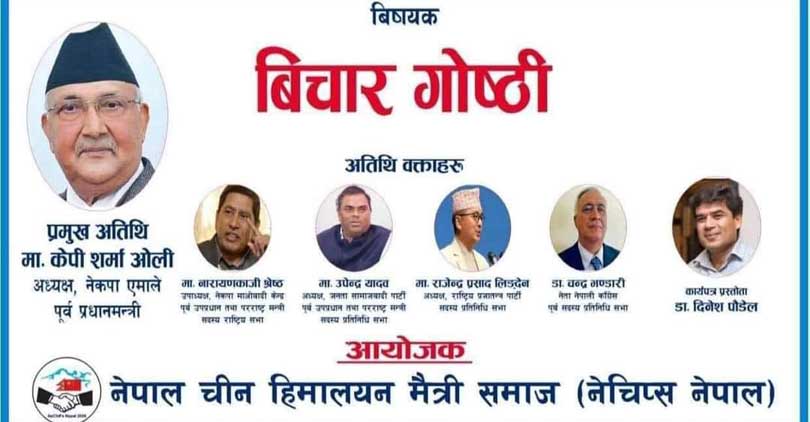 एमालेका अध्यक्ष खड्गप्रसाद ओलीलाई प्रमुख अतिति बनाएर चीन निकटको संस्था नेचिप्सले असार ३२ गते शनिबार काठमडौंमा विचार गाष्ठि राखेको हो । राष्ट्रिय सभामा दिउँसो १ बजे कार्यक्रम हुनेछ ।