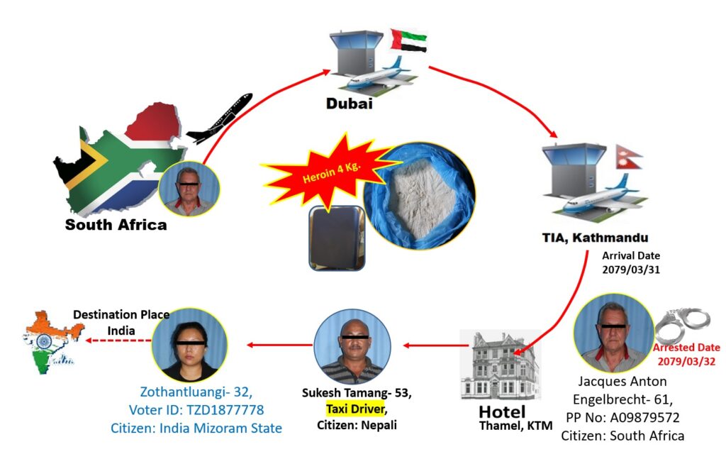 साउथ अफ्रिकाको जोहनेसबर्गबाट दुबई हुँदै काठमाडौंमा असार ३१ गते बिहान साढे ८ बजे अवतरण भएका साउथ अफ्रिकन नागरिक पासपोर्ट नम्वर ए०९८७९५७२ बाहक ६१ वर्षीय जस्क्युस एन्टोन एन्जलब्रेष्टको गतिविधि शंकास्पद देखिएपछि ब्यूरोको टोलीले निग्रानी गर्दै जाने क्रममा दिउँसो १ बजे ठमेलस्थित एक होटेलबाट ती व्यक्तिले सुटकेसभित्र पिँधको भागमा रहेको फल्सबटमबाट लागुऔषध हेरोईन जस्तो देखिने धुलो पदार्थ ४ किलोसहित पक्राउ गरिएको एसएसपी खनालले जानकारी दिए ।