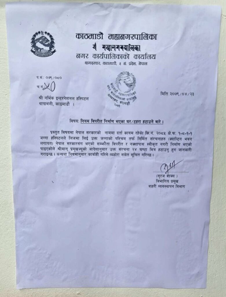 काठमाडौंको थापाथलीस्थित नर्भिक हस्पिटलले सरकारसँग भाडामा लिएको जग्गामा अनधिकृत रूपमा संरचना बनाएको भन्दै महानगरले भत्काउन अल्टिमेटम दिएको हो ।