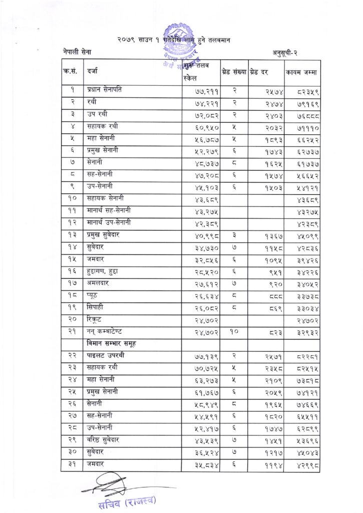 नेपाली सेनाका प्रधानसेनापतिको तलब पनि २ ग्रेडसहित ८२ हजार ३ सय ५९ रुपियाँ पुगेको छ ।