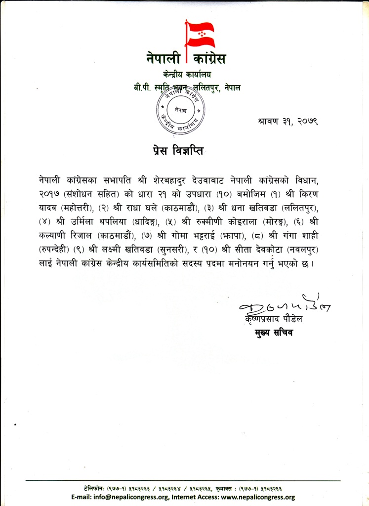 मंगलबार विज्ञप्ति जारी गरेर देउवाले कांग्रेसको विधान, २०१७ (संशोधनसहित) को धारा २१ को उपधारा (१०) बमोजिम केन्द्रीय सदस्यमा मनोनयन गरेका हुन् ।