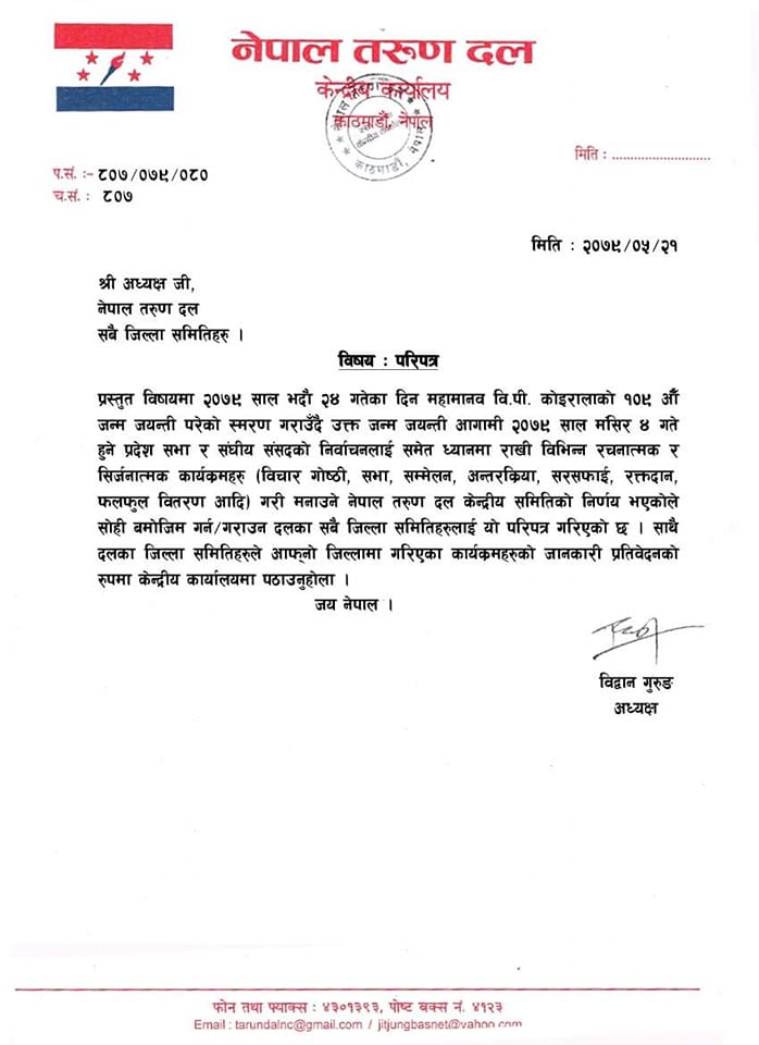 रचनात्मक र सिर्जनात्मक कार्यक्रमहरू गरी वीपी कोइरालाको जन्म जयन्ती मनाउन उनले परिपत्रमा उल्लेख गरेका छन् ।