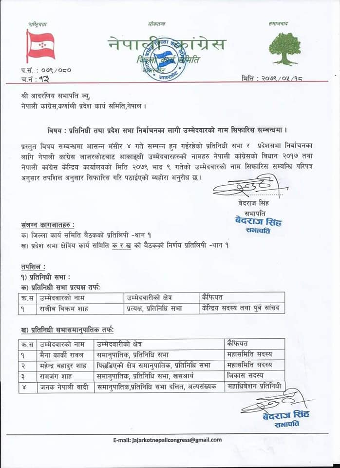 जाजरकोट कांग्रेसका सभापति बेदराज सिंहले नेता शाहलाई सर्वसम्मत एकल रुपमा टिकटका लागि सिफारिस गरेको जानकारी दिएका छन् ।